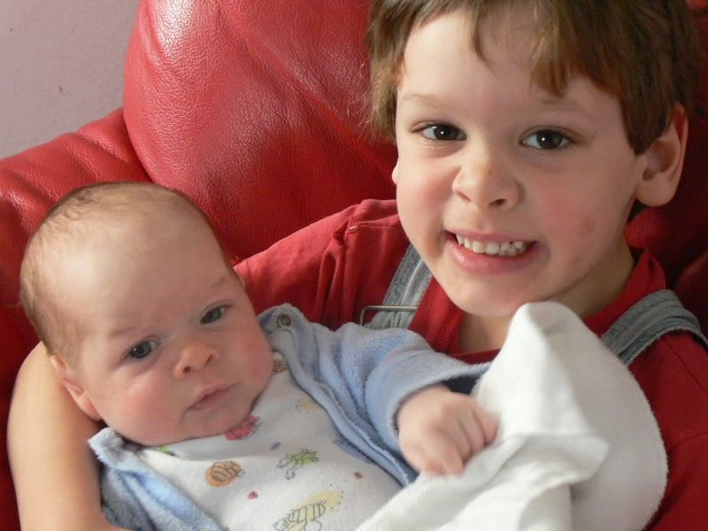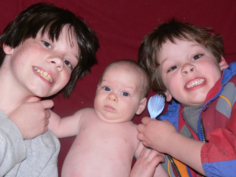 The big brothers love the new li'l one... Stevie is ecstatic that he is now a "big" brother instead of being the smallest guy all the time.